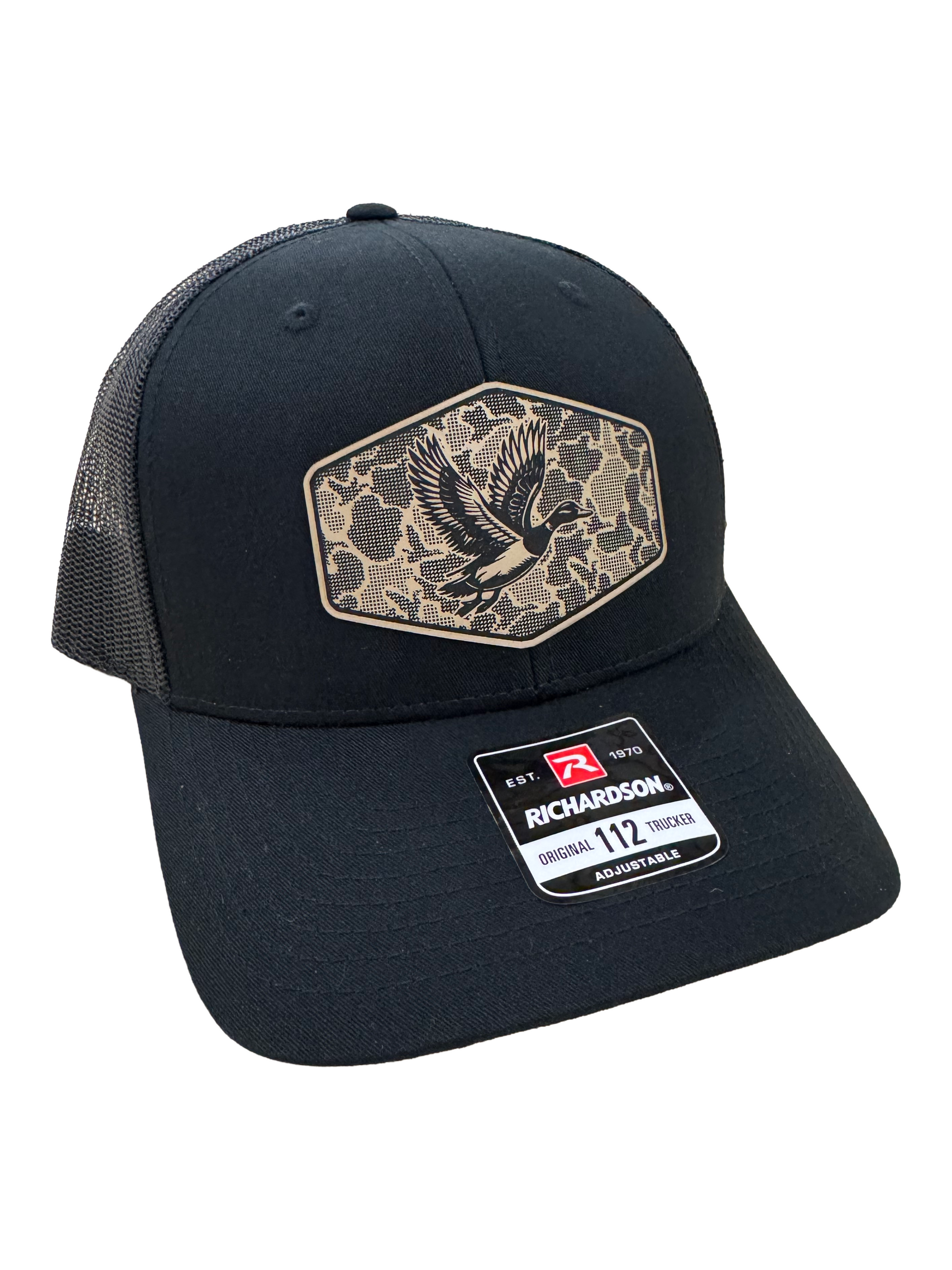 Stay sharp in our Still Fly trucker hat, built for anyone who likes their style bold, clean, and unmistakably outdoors. This Richardson 112 features a breathable mesh back, structured crown, and a laser-engraved patch showcasing a duck in mid-flight over a rugged camo background.